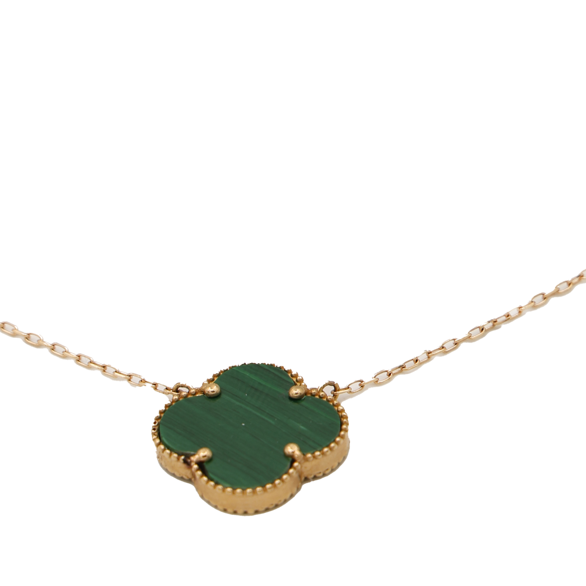 A green Van Cleef & Arpels necklace generally refers to necklaces with the four-leaf clover design of the Van Cleef & Arpels brand that use a green stone or material. This green color can come from precious stones like emerald, malachite, peridot, or other semi-precious stones, or even materials like ceramic or green mother-of-pearl.